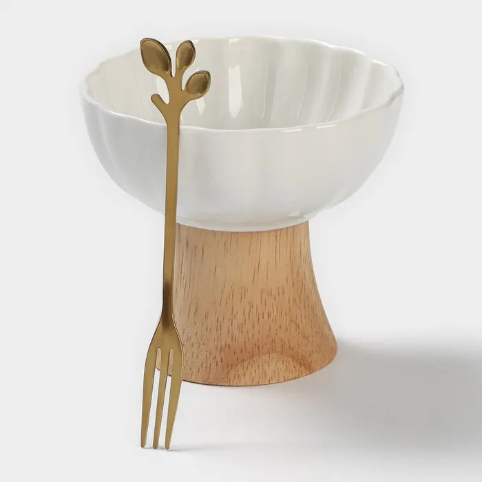 Креманка, d=10 см, с вилкой h=13 см, керамика, бамбук, белая
