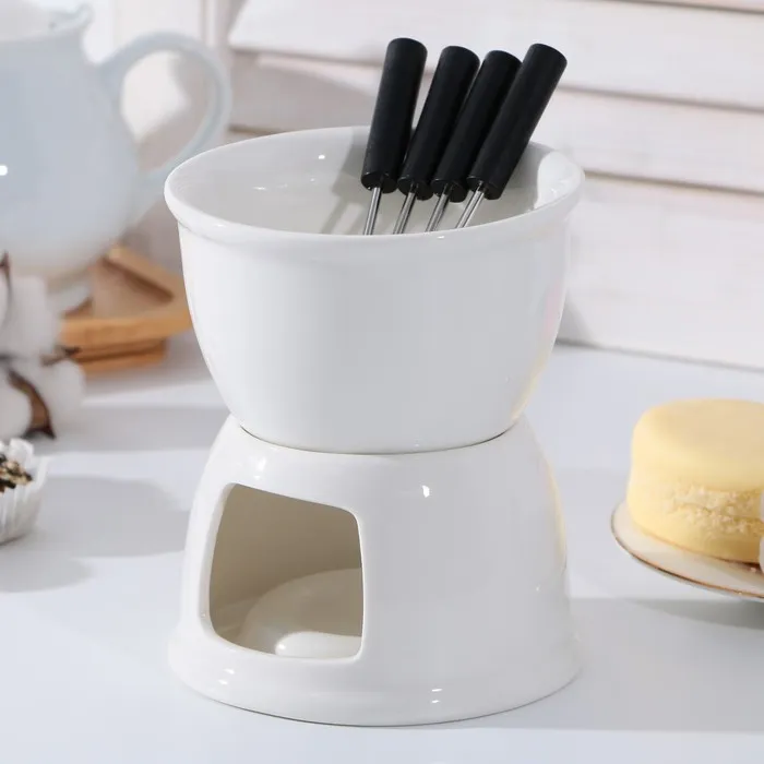 Набор для фондю Доляна «Глянец», 6 предметов: чаша 400 мл, подставка, 4 шпажки, керамика, белый