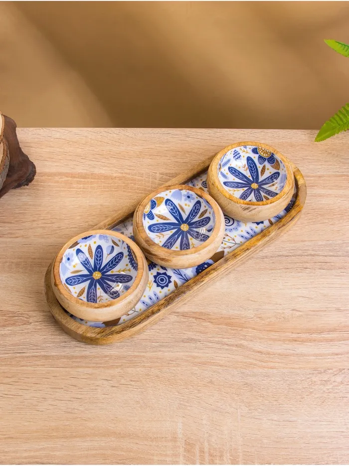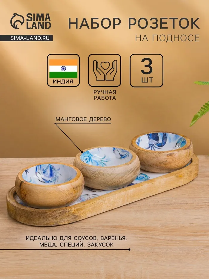 Набор розеток на подносе «Васильки», 3 шт., 33.5×13×6.5 см, дерево манго