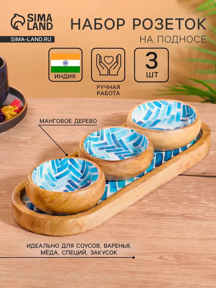 Набор розеток на подносе «Синяя мозайка», 3 шт., 33.5×13×6.5 см, дерево манго