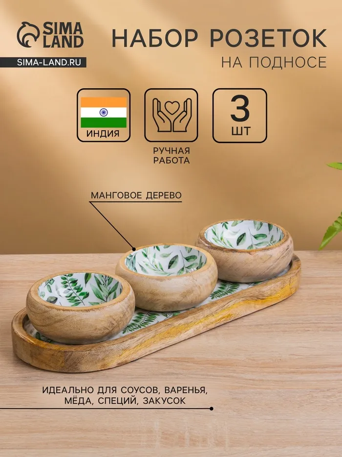 Набор розеток на подносе «Оливковая ветвь», 3 шт., 33.5×13×6.5 см, дерево манго