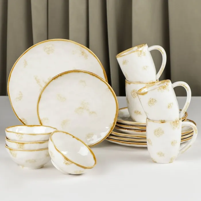 Набор посуды Доляна Organic Gold, 16 предметов: 4 тарелки d=20.5 см, 4 тарелки d=27.5 см, 4 миски d=12.5 см, 400 мл, 4 кружки 400 мл, фарфор, белый