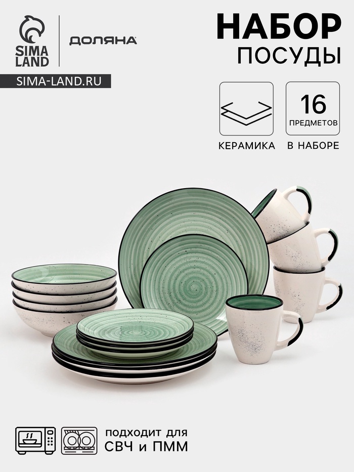 Набор посуды Доляна Nature Тар, 16 предметов: тарелки 8 шт. d=19 см, 27 см, глубокие 4 шт. 830 мл, кружки 4 шт. 400 мл, керамика, зелёный