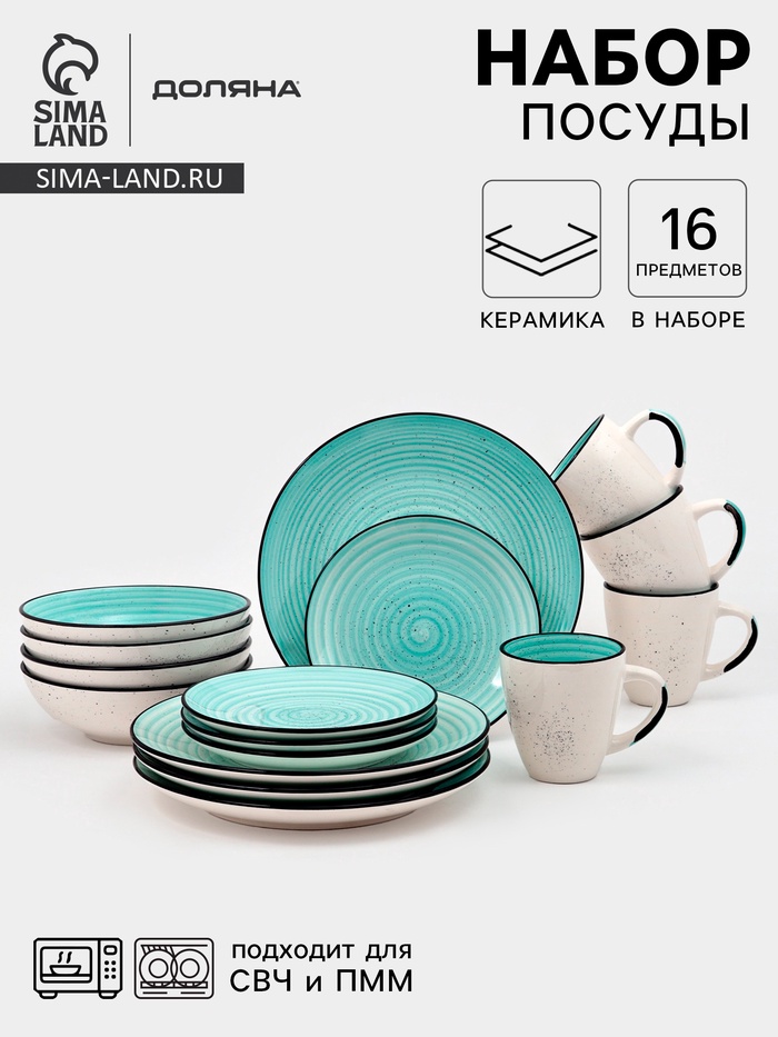 Набор посуды Доляна Nature Тар, 16 предметов: тарелки 8 шт. d=19 см, 27 см, глубокие 4 шт. 830 мл, кружки 4 шт. 400 мл, керамика, голубой
