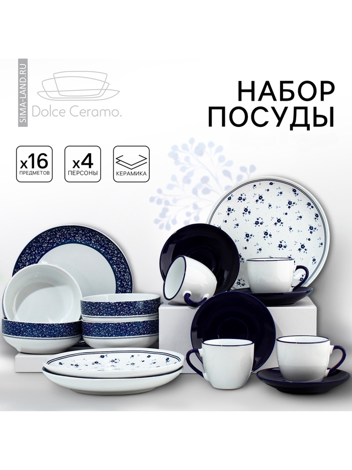 Посуда «Синие цветы»: 4 тарелки d=23 см, 4 миски d=14.5 см, 4 кружки 250 мл, 4 блюдца d=15 см