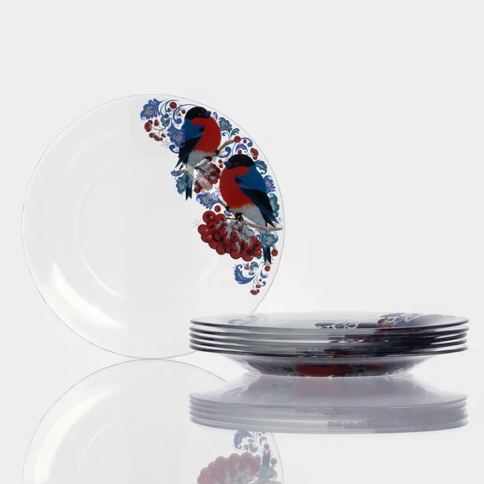 Набор новогодних стеклянных тарелок «Снегири на рябине», d=19,6 см, 6 шт