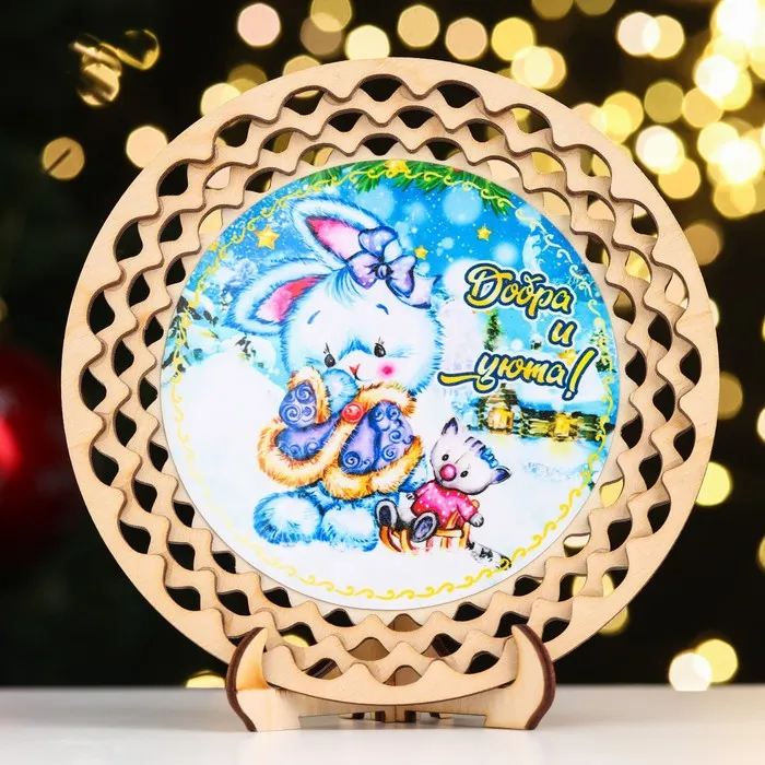 Тарелка сувенирная «Год Кролика. Добра и уюта», дерево, ламинация, d=13 см