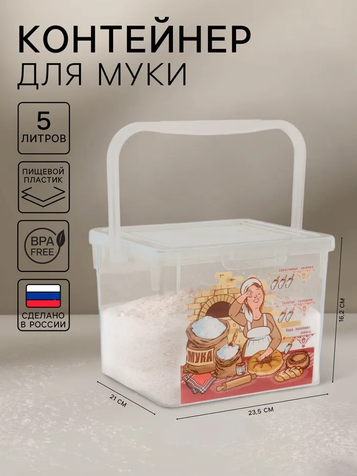 Контейнер для муки с ручкой, 5 л, пластик, прозрачный