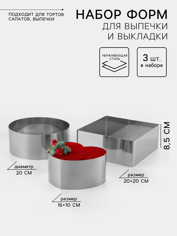 Формы для выпечки и выкладки TAS-PROM «Круг, квадрат, сердце», 20×20×8.5 см, нержавеющая сталь, 3 шт.