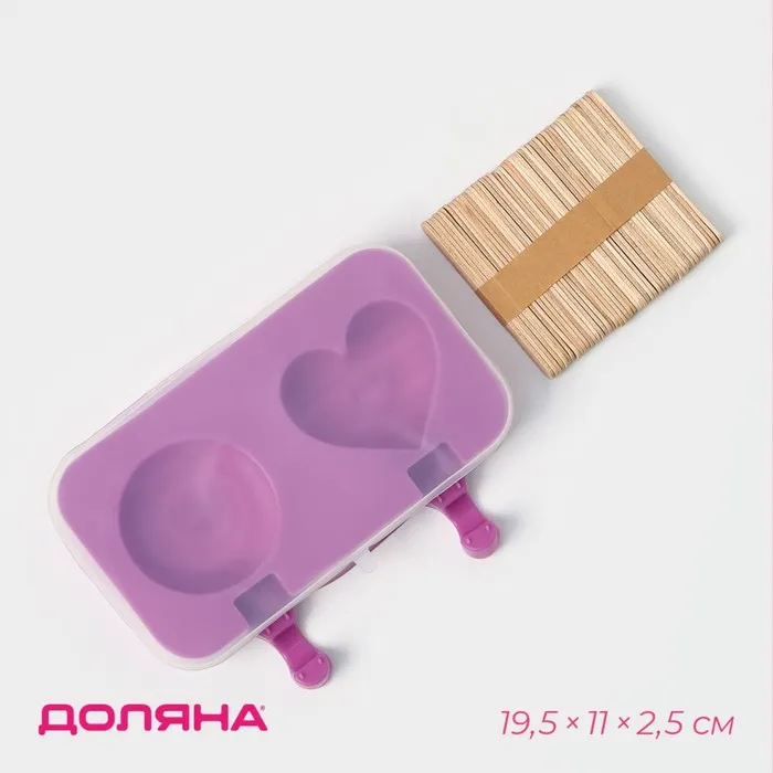 Форма для мороженого «Любовь», силикон, 19.5×11×2.5 см, 2 ячейки, с крышкой и палочками (50 шт.), сиреневая