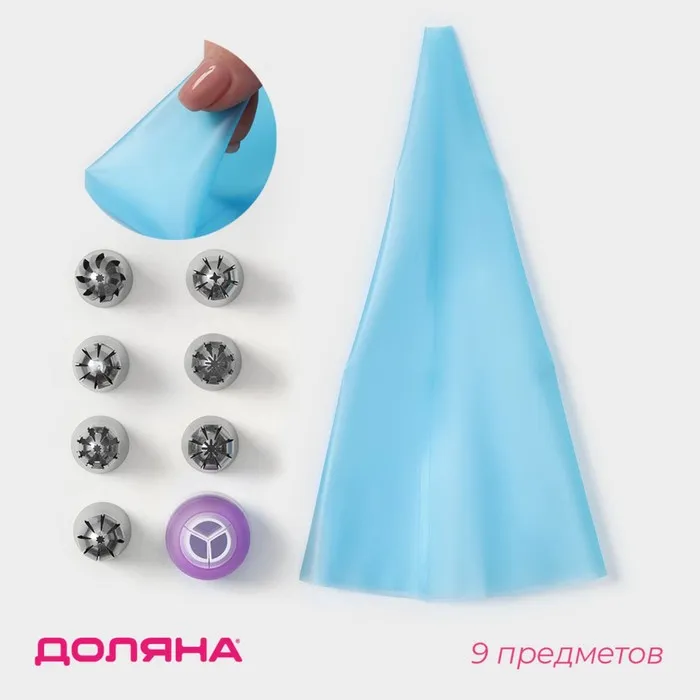 Набор кондитерский Доляна, 9 предметов: мешок 32 см, 7 насадок (d=3 см), адаптер, насадки МИКС