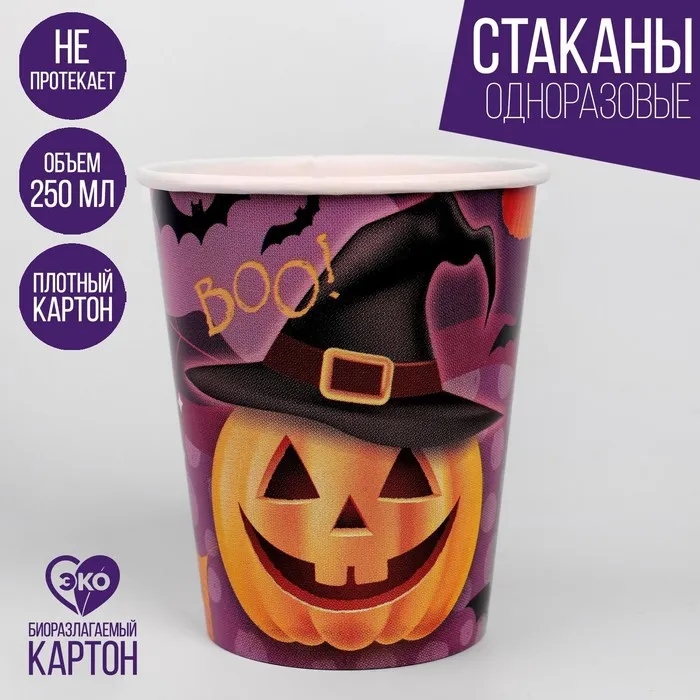 Стакан одноразовый бумажный «Весёлая тыква», 250 мл, набор 6 шт., на Хэллоуин