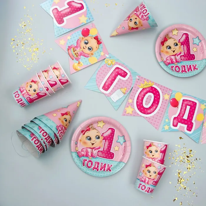 Посуда бумажная одноразовая «С днём рождения. 1 годик», 6 тарелок, 6 стаканов, 6 колпаков, 1 гирлянда