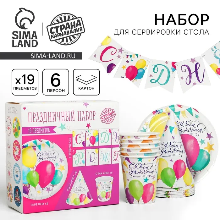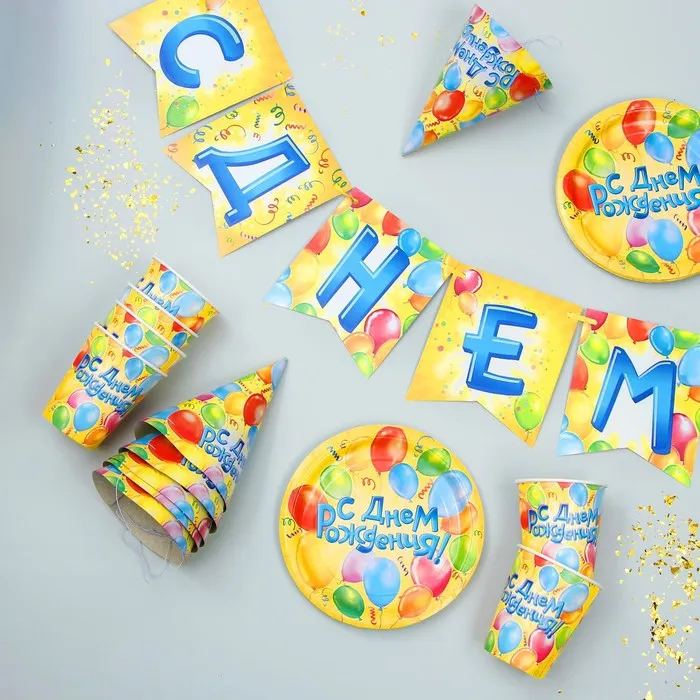 Набор бумажной посуды одноразовый С днём рождения», воздушные шары, 6 тарелок, 6 стаканов, 6 колпаков, 1 гирлянда