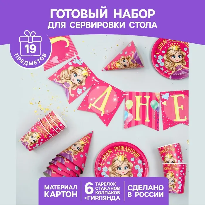 Набор бумажной посуды «С днём рождения. Принцесса»: 6 тарелок, 6 стаканов, 6 колпаков, 1 гирлянда