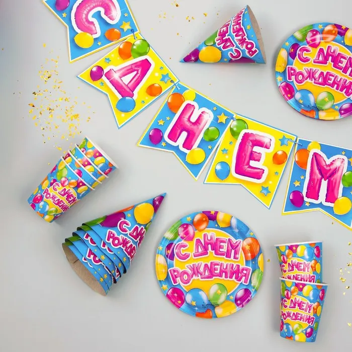 Посуда одноразовая бумажная для праздника «С днем рождения», набор, 6 тарелок, 6 стаканов, 6 колпаков, гирлянда