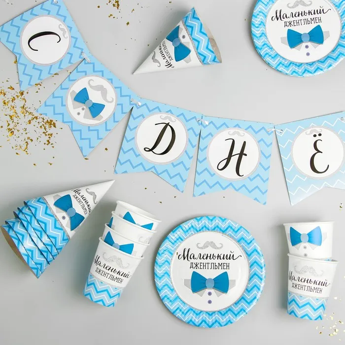 Одноразовая посуда «С днём рождения. Маленький джентльмен», 6 тарелок, 6 стаканов, 6 колпаков, 1 гирлянда