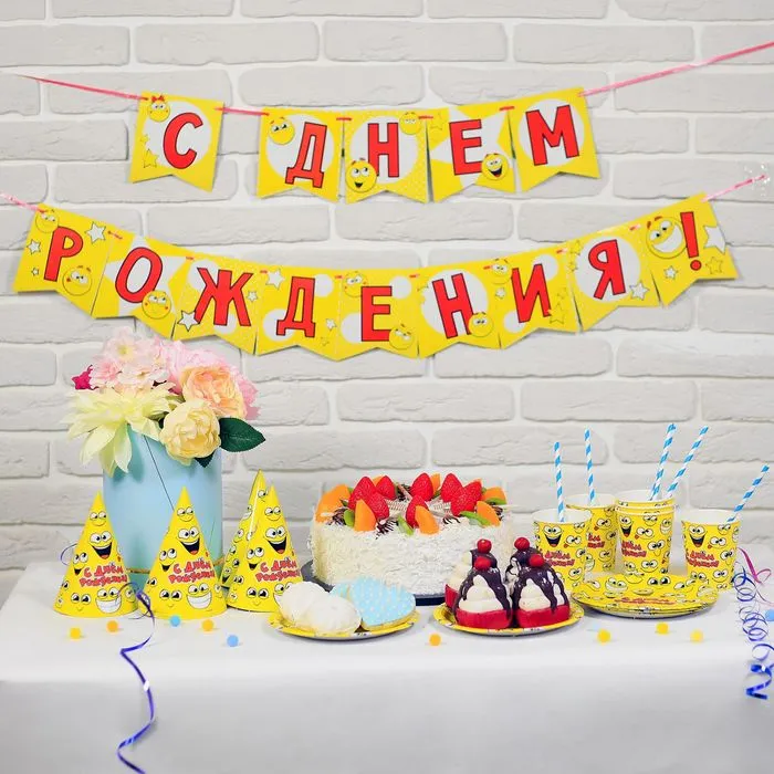 УЦЕНКА Одноразовая посуда «С днём рождения», смайлики: 6 тарелок, 6 стаканов, 6 колпаков, 1 гирлянда