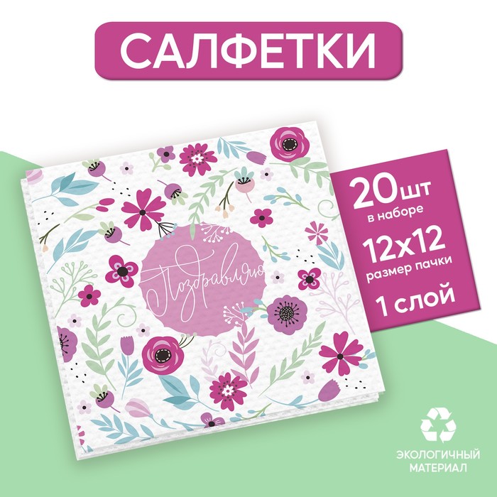 Салфетки бумажные однослойные «Поздравляю», 24 × 24 см, в наборе 20 шт.