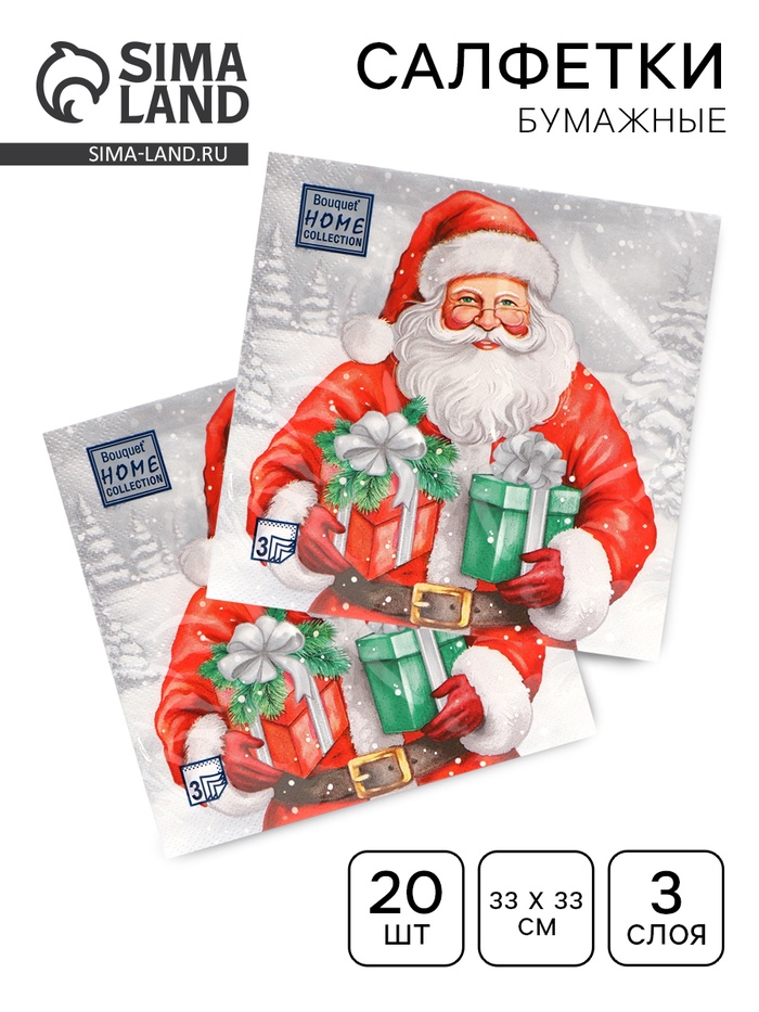 Салфетки новогодние бумажные Home Collection «Дедушка Мороз с подарками», 3 слоя, 33×33 см, 20 шт.