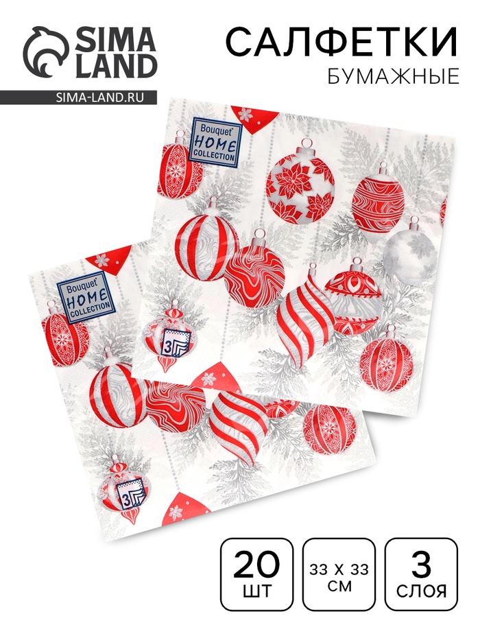 Салфетки новогодние бумажные Home Collection «Красные игрушки на серебре», 3 слоя, 33×33 см, 20 шт.