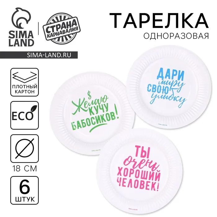 Тарелка одноразовая бумажная «Хвалебная», 18 см, набор 6 шт.