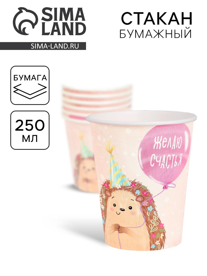 Стакан одноразовый бумажный «Желаю счастья, ёжик», розовый, 250 мл