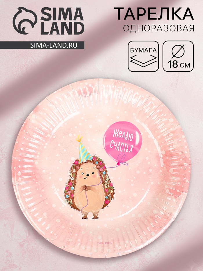 Тарелка одноразовая бумажная «Желаю счастья, ёжик», розовая, 18 см
