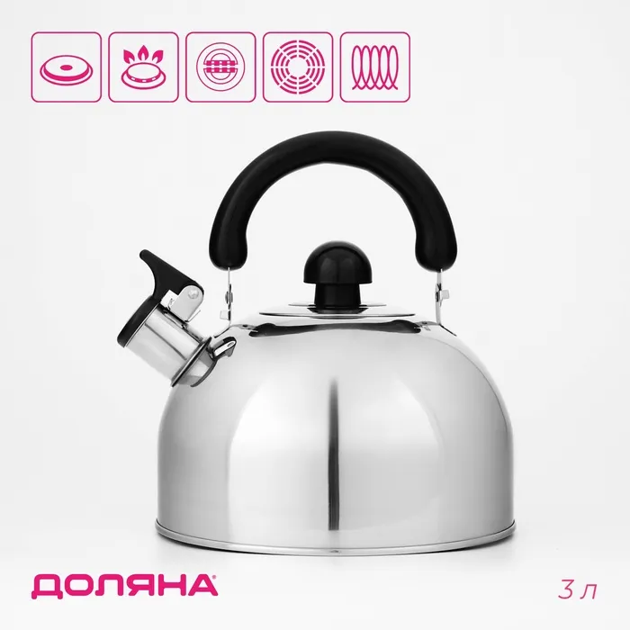 Чайник со свистком Доляна «Чёрная ночь», 3 л, нержавеющая сталь, фиксированная ручка, хромированный