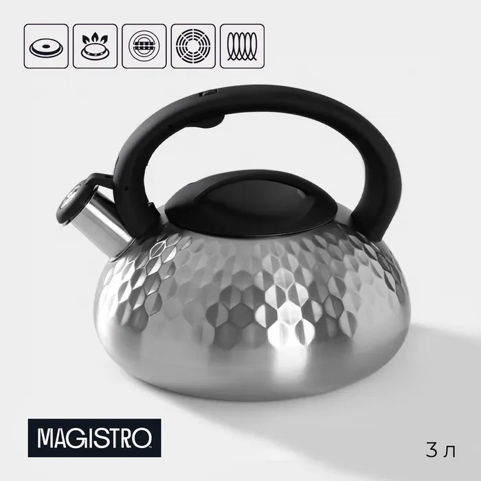 Чайник Magistro Glow, 3 л, со свистком, ручка soft-touch, индукция, нержавеющая сталь, серебристый