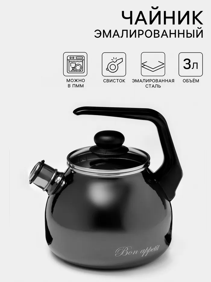 Чайник Bon appetit, 3 л, со свистком, индукция, эмалированная сталь, серый