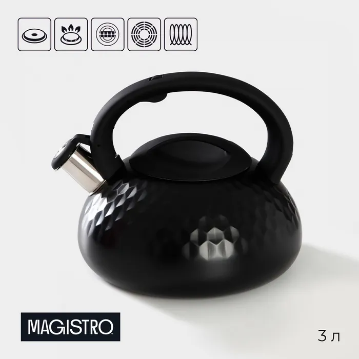 Чайник Magistro Glow, 3 л, со свистком, ручка soft-touch, индукция, нержавеющая сталь, чёрный