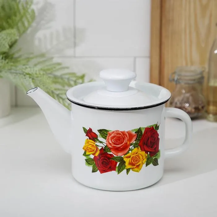 Чайник, 1 л, эмалированная сталь, деколь МИКС, белый