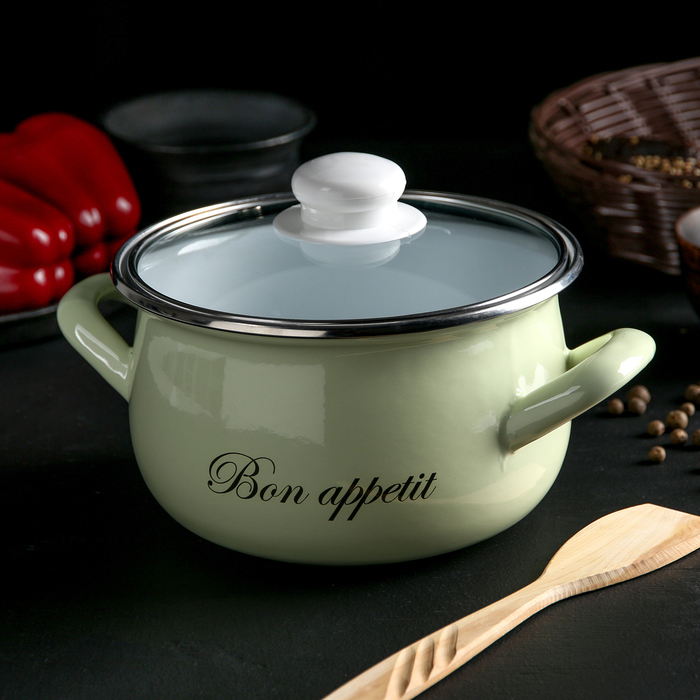 Кастрюля эмалированная «Лайм», 3.1 л, стеклянная крышка, индукция, цвет светло-зелёный