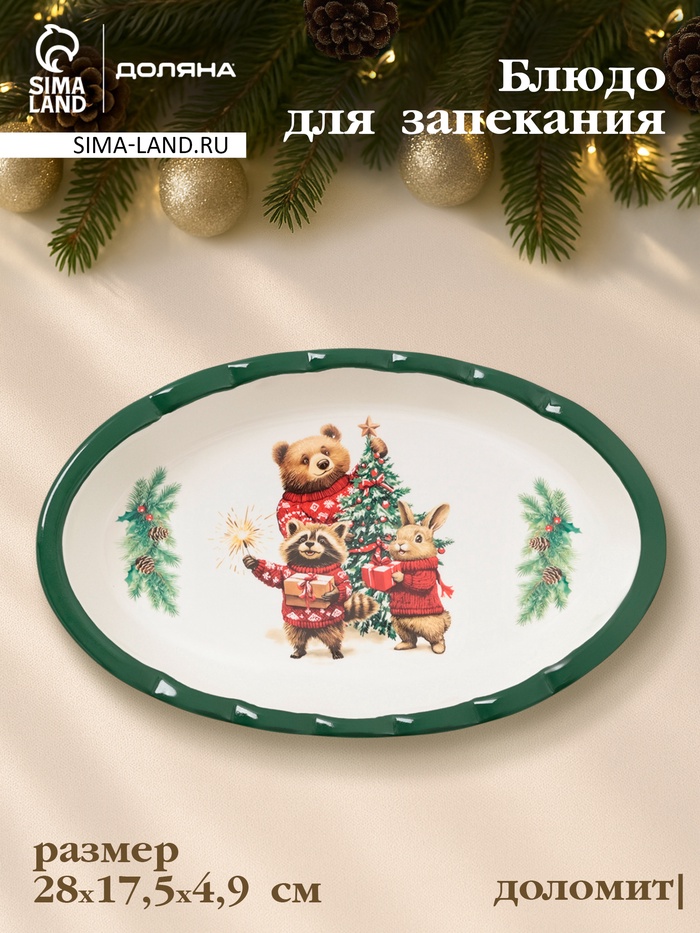 Блюдо для запекания новогоднее Доляна «Сказки зимнего леса», 1.03 л, 28×17.5×4.9 см, доломит, белое