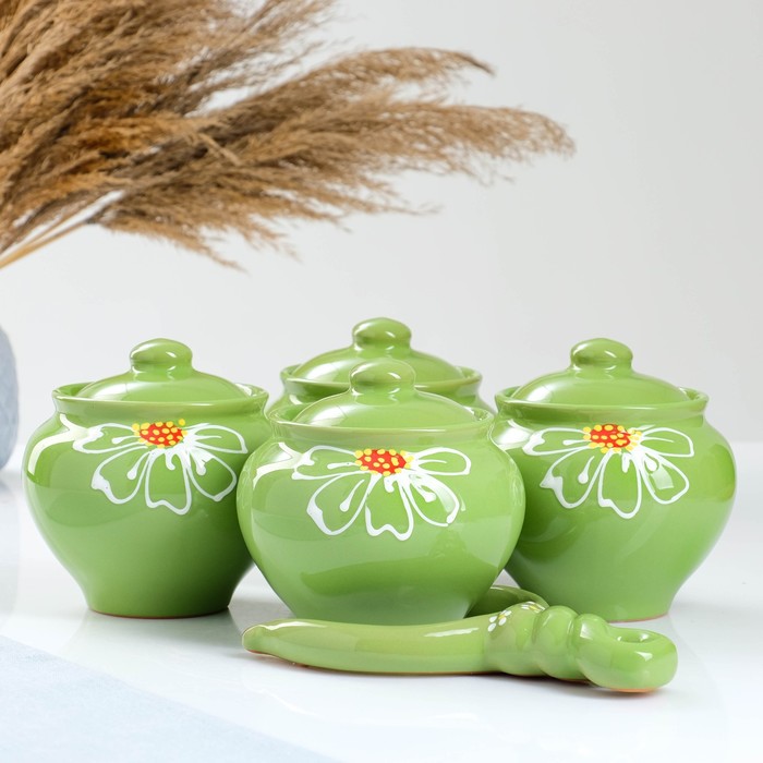 Горшочки для запекания Псковский гончар «Ромашка зелёная», набор 4 шт., 850 мл, с ухватом, керамика