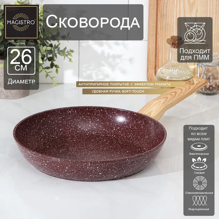 Сковорода Magistro Natural. Brown, d=26 см, кованый алюминий, ручка soft-touch, антипригарное покрытие, индукция, коричневая