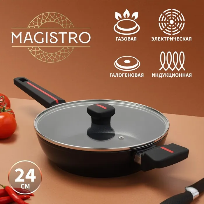 Сковорода Magistro Flame, d=24 см, h=6.3 мм, кованый алюминий, со стеклянной крышкой, ручка soft-touch, антипригарное покрытие, индукция, чёрная