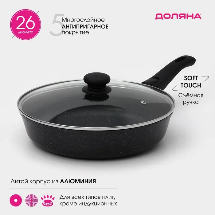Сковорода алюминиевая Доляна «Элит», d=26 см, съёмная ручка, стеклянная крышка, антипригарное покрытие