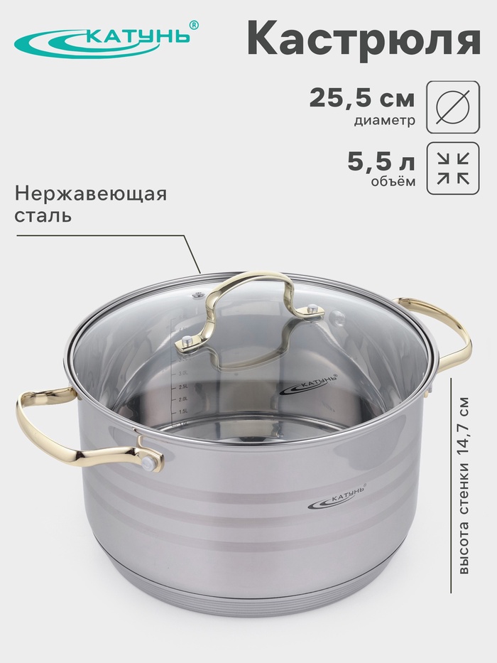Кастрюля Катунь «ЭЛИС ГОЛД», 5.5 л, 24×13.5 см, стеклянная крышка, нержавеющая сталь, ручки золотистые