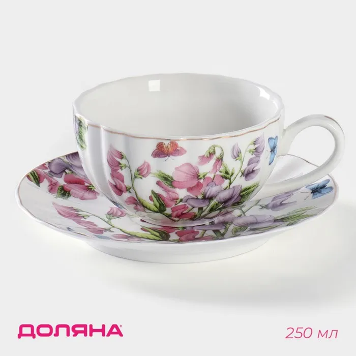 Чайная пара Доляна «Колокольчики», чашка 250 мл, блюдце d=15 см, керамика, белая