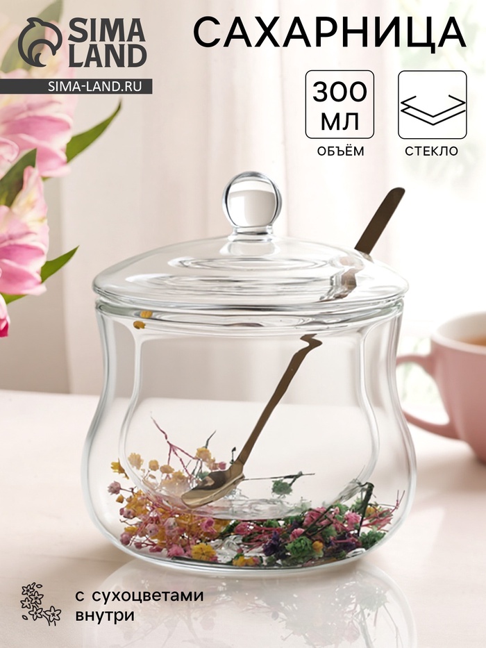 Сахарница с двойными стенками «Флора», 300 мл, 11×12 см, с сухоцветами, с ложкой, стекло, прозрачная