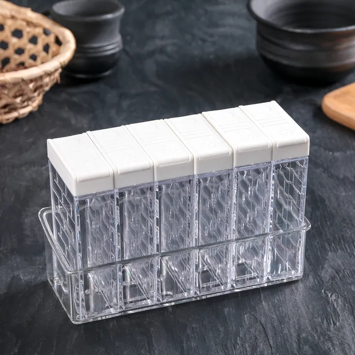 Ёмкости для специй «Компакт», набор 6 шт. на подставке, двустороннмй дозатор, 16×11×7 см, прозрачные