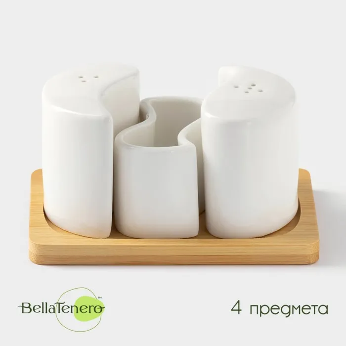 Набор керамический для специй на деревянной подставке BellaTenero, 3 предмета: солонка 70 мл, перечница 70 мл, салфетница, белый