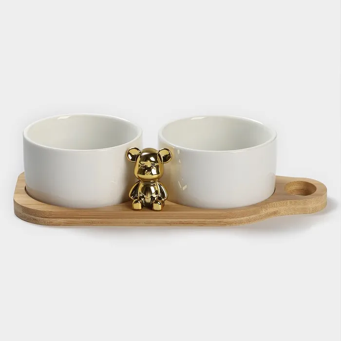 Соусники на деревянной подставке «Стильный Мишка», набор 2 шт., 120 мл, керамика, белые