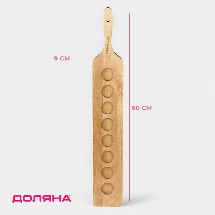 Доска деревянная для подачи шотов с ручкой, 60×9×1,8 см, на 8 рюмок, диаметр ячеек 3,9 см, с пропиткой, берёза