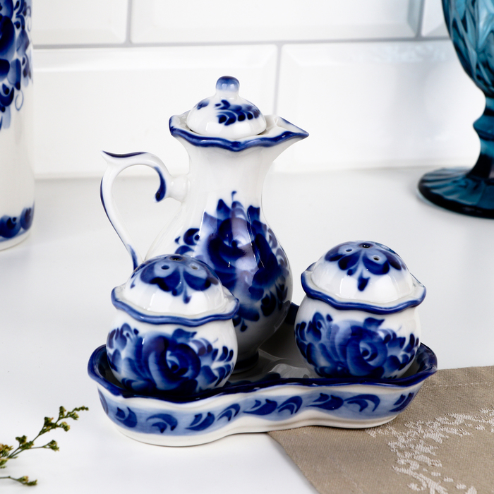 Набор для специй на подставке с молочником (питчером) «Весенний», 4 предмета, фарфор, гжель