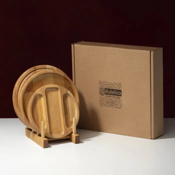 Подарочный набор деревянной посуды Adelica «Бари», доска разделочная d=25 см, блюдо для подачи d=24 см, менажница 3 секции d=20 см, подставка, берёза