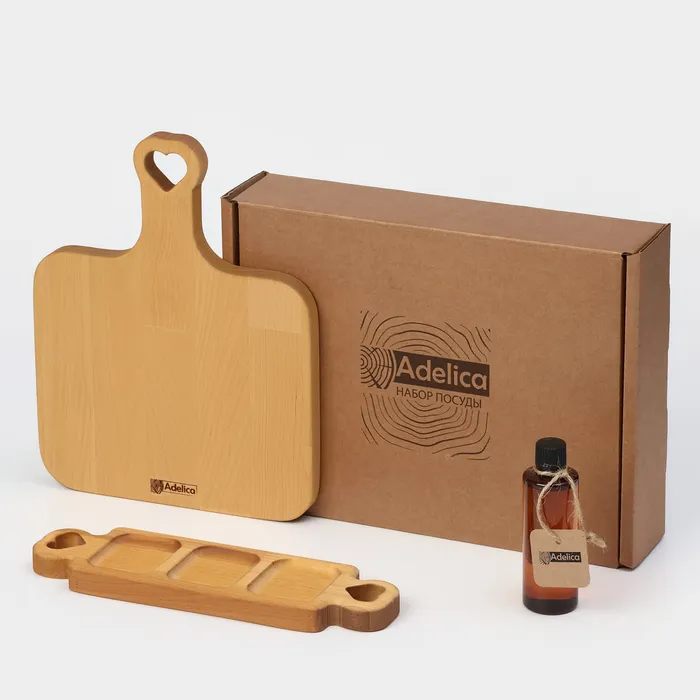 Подарочный набор деревянной посуды Adelica, доска разделочная, менажница 3 секции, масло в подарок 100 мл, берёза