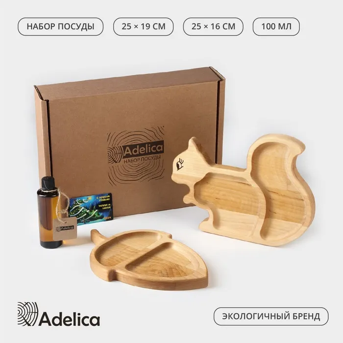 Подарочный набор деревянной посуды Adelica «Белка с орехом», менажницы: белка 25×19 см, орех 25×16 см, масло 100 мл, магнит в подарок